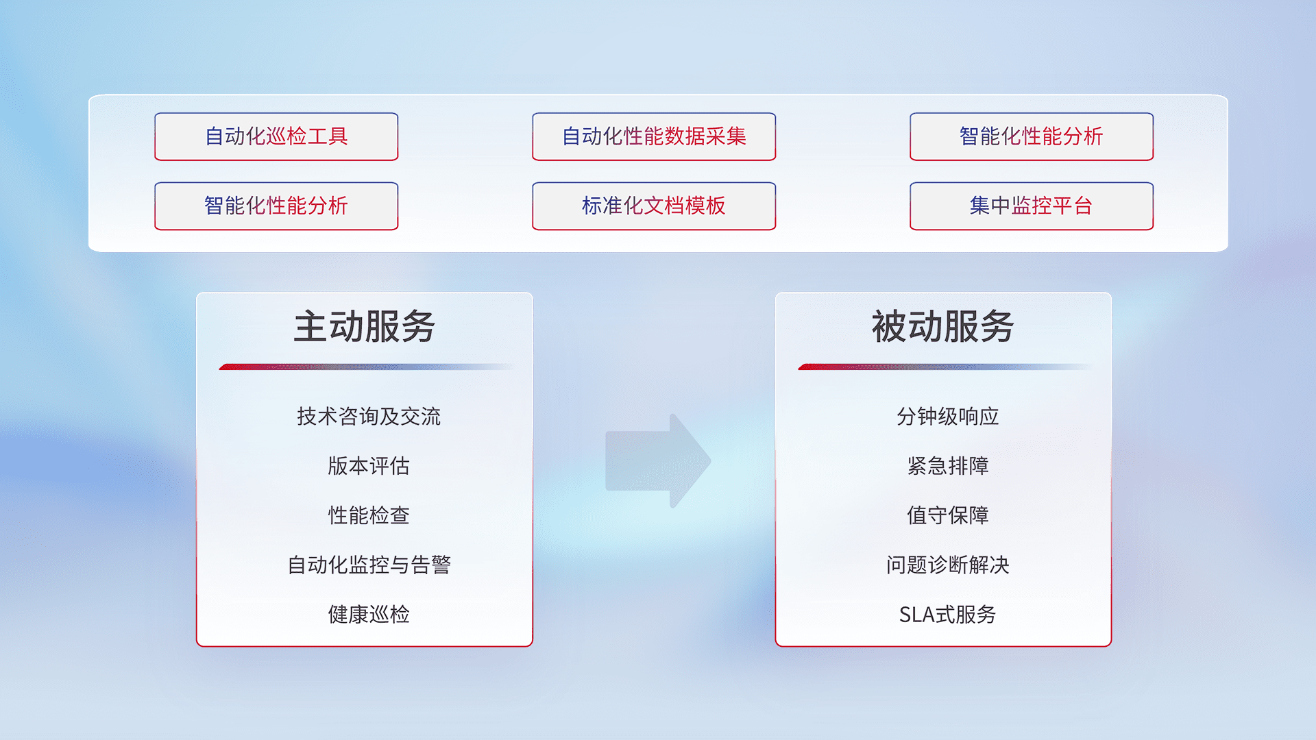 智能化工具和标准化文档,,,,保障服务质量,,提供主动服务(包含技术咨询、、版本评估、、、性能检查、、、、自动化监控与告警、、、健康巡检)和被动服务包含(分钟级响应、、、紧急排障、、、、值守保障、、问题诊断解决、、、SLA服务)。。。。